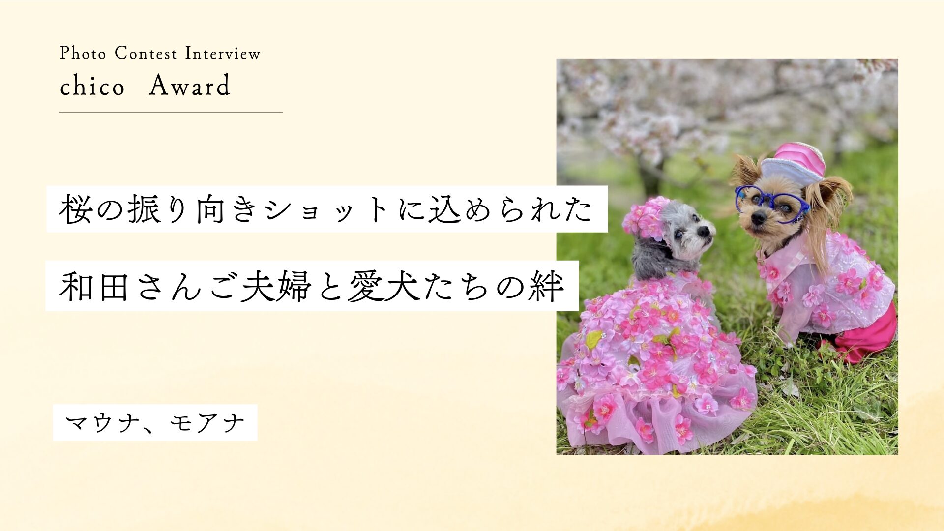 春の柔らかな日差しの中、満開の桜を背景に振り向く小さな瞳。その一枚が、今回のフォトコンテストでchico賞に輝きました。今も元気に暮らすチワプーのマウナちゃんと、すでに虹の橋を渡ったヨーキーのモアナくんとが並ぶ桜の振り向きショット。和田さんご夫婦にとって大切な思い出を残した一枚が、多くの人の心を惹きつけました。