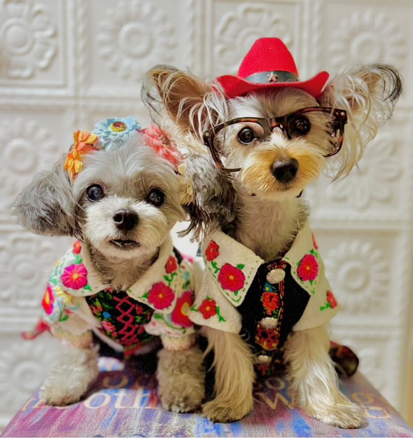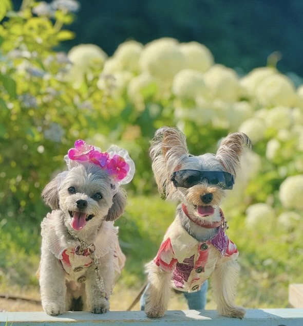 夏にはご夫婦と2匹でお揃いのアロハシャツを着る「リンクコーデ」を楽しみます。パパさんは普段からアロハシャツしか着ないそうで、そのこだわりが愛犬たちにも反映され、20パターン以上のファミリーコーデが完成しました。まさに「家族全員で一枚の絵になる」ような存在感です。